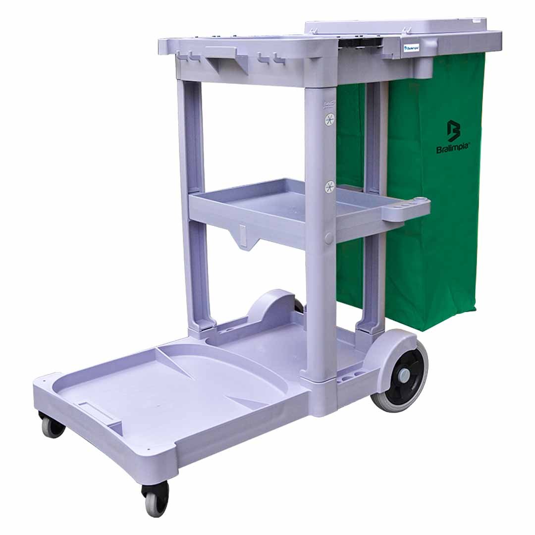 O Carro Funcional América Bralimpia é um equipamento de limpeza profissional completo, desenvolvido com estrutura de polipropileno de alta resistência e design ergonômico. Projetado para otimizar a produtividade, permite o transporte organizado de produtos e acessórios, integrando compartimentos para baldes, prateleiras e um saco coletor em vinil de alta capacidade.