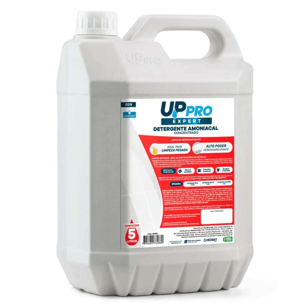 O Detergente Amoniacal Concentrado E09 Uppro de 5L é um saneante profissional de alta performance, formulado com hidróxido de amônio para oferecer máxima eficiência na remoção de gorduras e sujeiras pesadas em diversas superfícies laváveis.